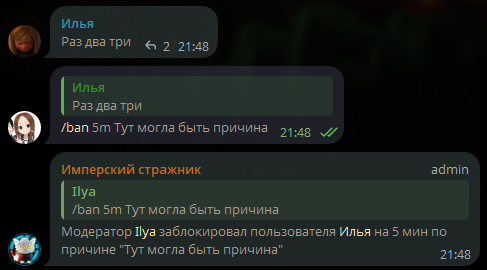 /ban <id/упоминание/ответ> (<длительность>) (<причина>)