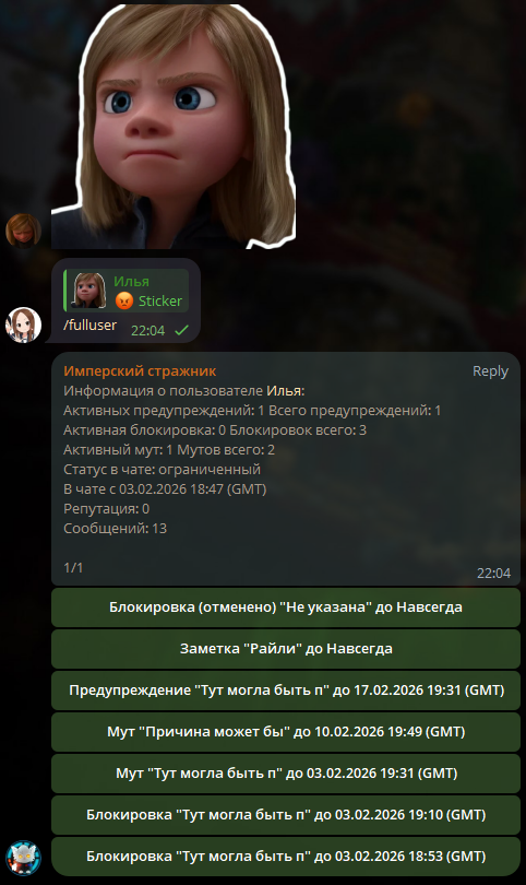 Выдает полную информацию о пользователе, включая отменённые нарушения. Позволяет управлять нарушениями пользователя.