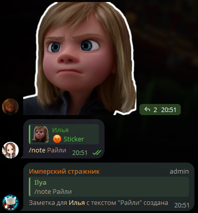 Создаёт заметку в профиле пользователя. Полезно для того, чтобы оставить заметку о поведении пользователя.