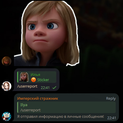 Составляет отчёт о пользователе. В отчёте содержится информация: о репортах, о последних известных данных, о наказаниях, об опыте модерации. Отчёт отправляется в личные сообщения в виде txt-файла.