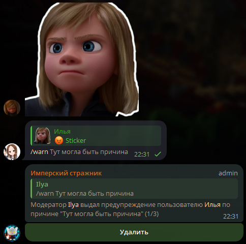 Выдаёт предупреждение пользователю. Для настройки логики выдачи предупреждений используйте настройки.