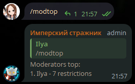 modtop Displays the top moderators of the chat. /modtop If extended mode is enabled, the result will look like this: